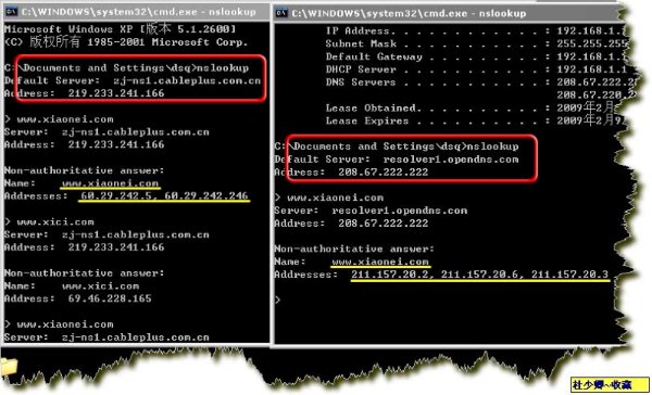 更换为opendns后与之前cablemodem的的DNS查找结果对比: